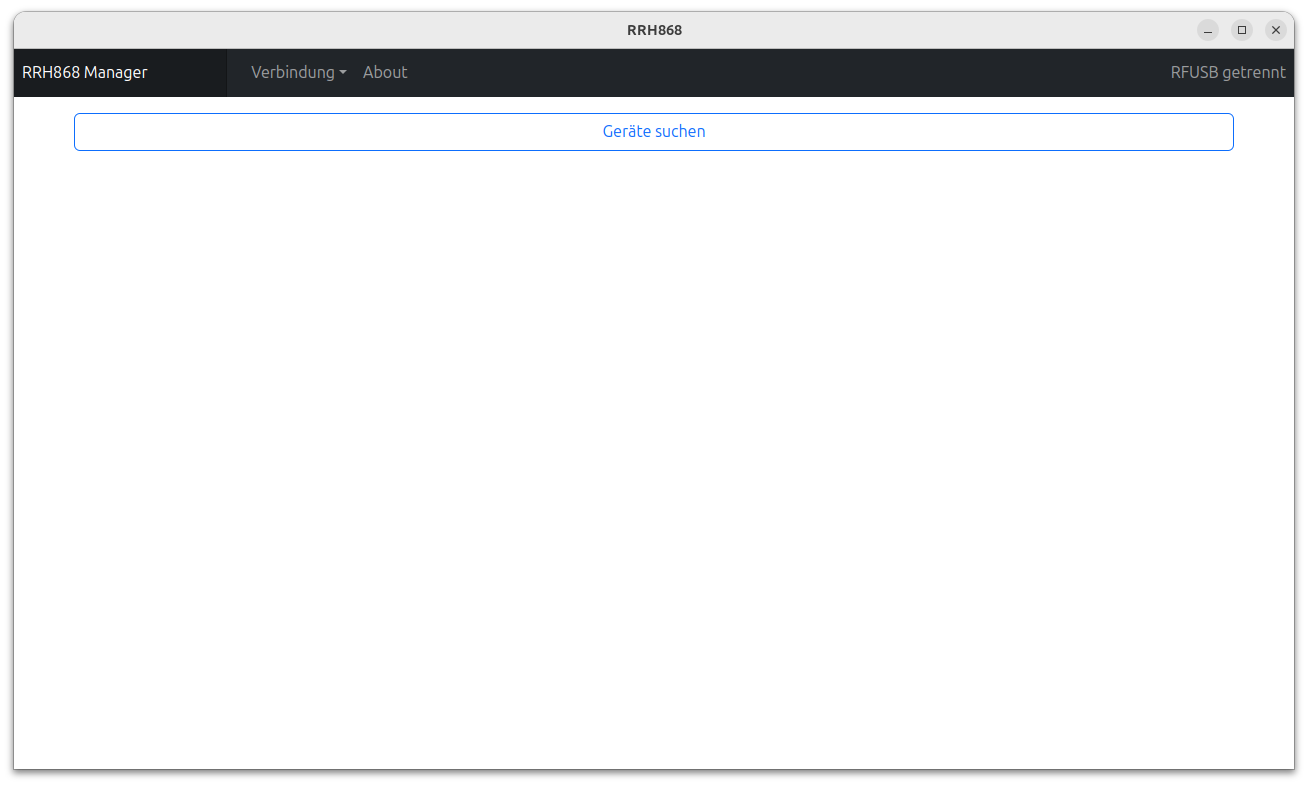 Nach dem Starten der Applikation öffnet sich ein Fenster mit einem Button um nach Geräten zu suchen und mit einem Header. Im Header werden die Menüpunkte zum Verbinden und Trennen des USB Sticks angezeigt.