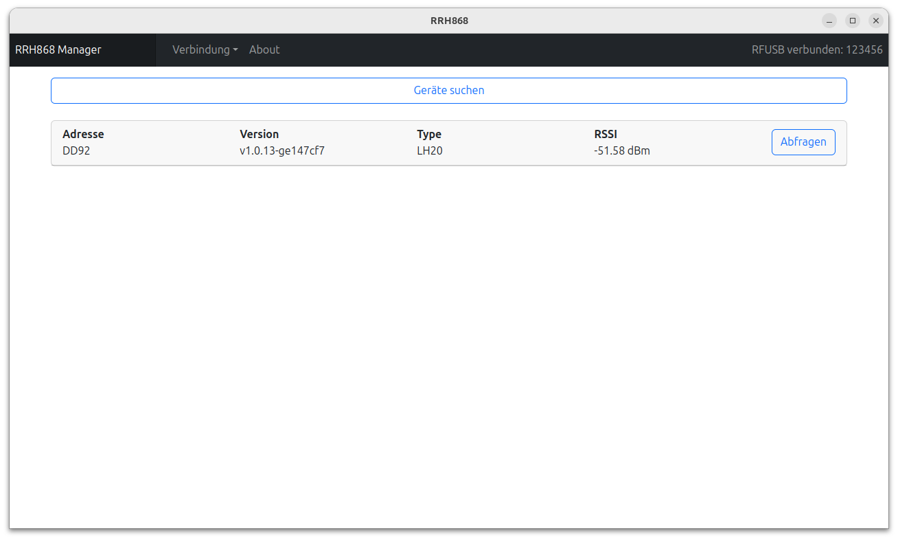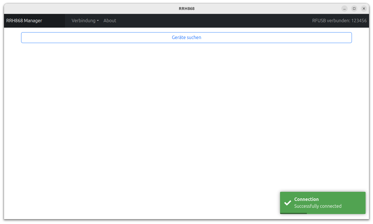 In der PC Applikation wird im Menü Verbindung der Punkt RFUSB verbinden ausgewählt. Wenn der RFUSB USB Stick mit dem PC verbunden ist und die Verbindung erfolgreich hergestellt werden konnte, wird dies durch ein Popup am rechten unteren Rand des Fensters angezeigt. Zusätzlich wird die Seriennummer oben rechts im Header angezeigt.